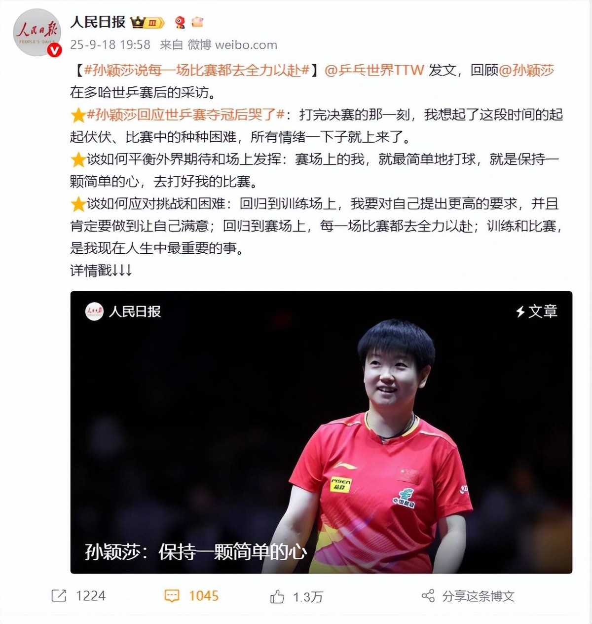 人民日报发文在前段时间,人民日报直接带着孙颖莎的话题转发,为她的比赛加油!